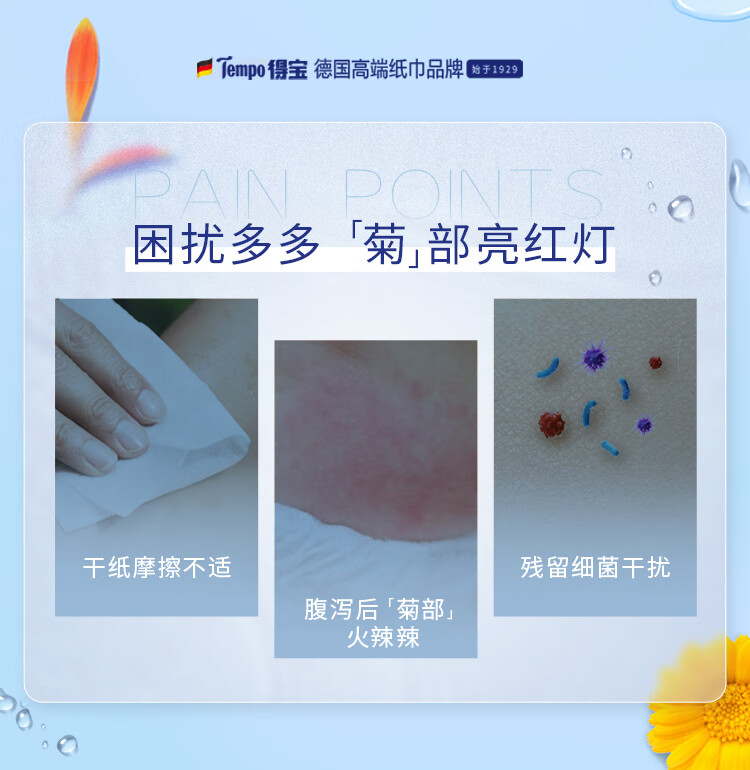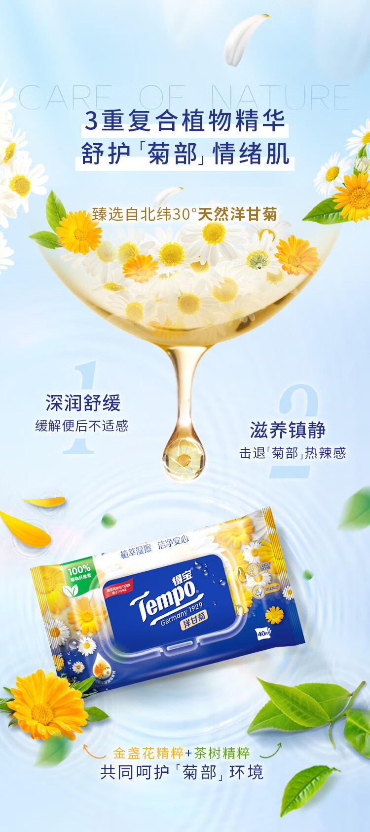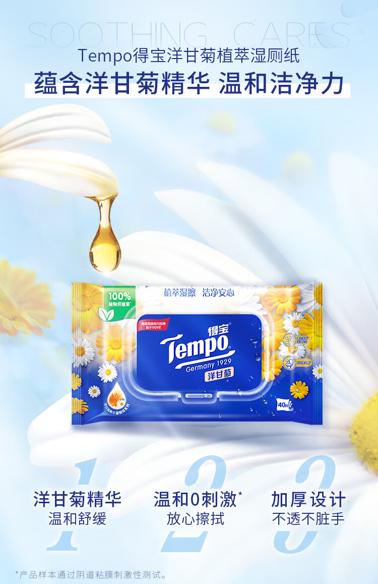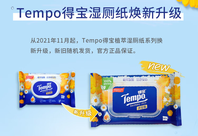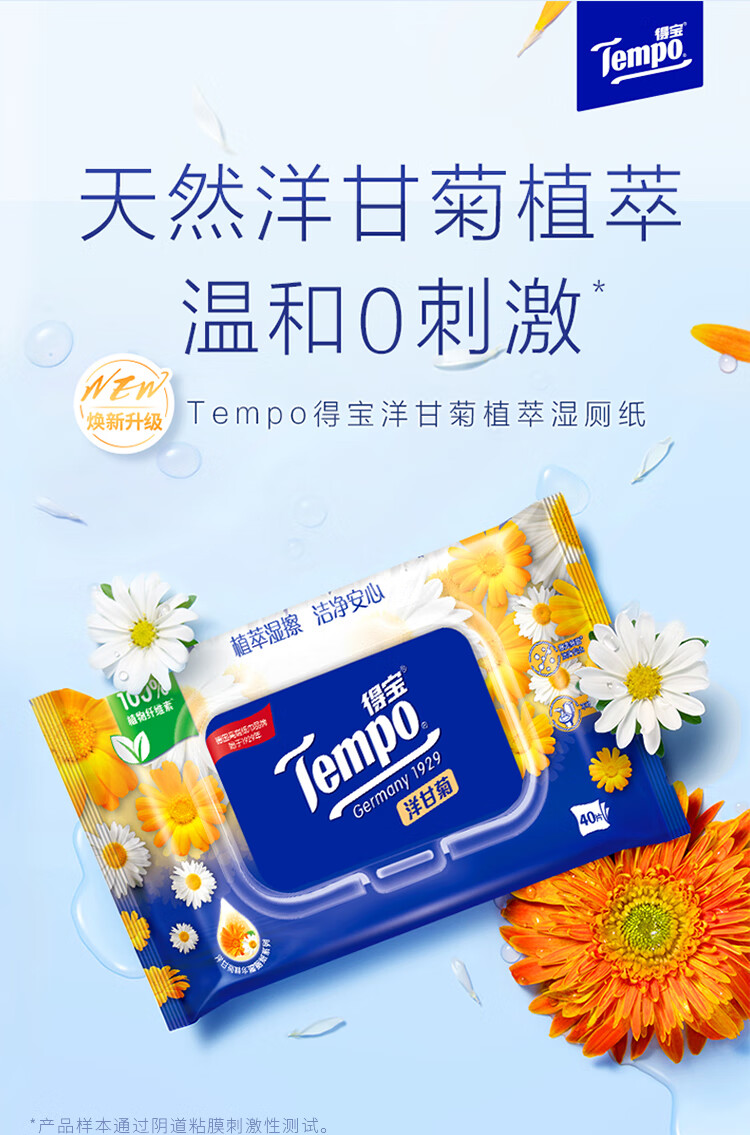 得宝(TEMPO)Tempo/得宝洋甘菊湿厕纸40片1包私处清洁不刺激卫生湿巾胶盖装